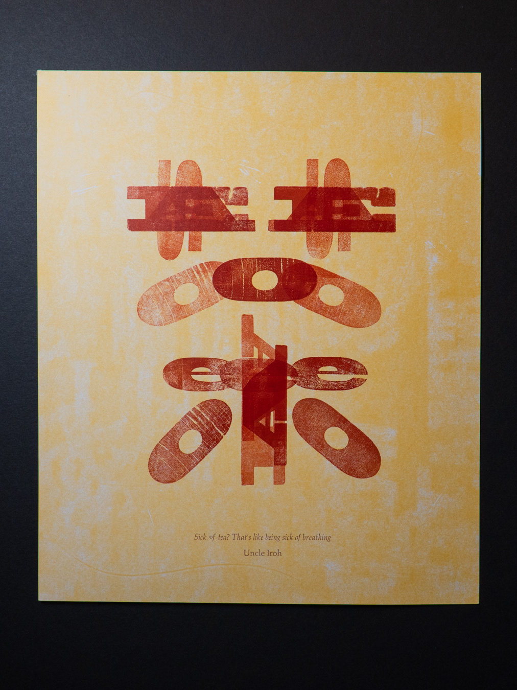 Letterpress printed poster using Latin letters to create tea "茶" in Chinese.